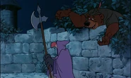 Als er sich wieder auf seinem Stuhl niederlässt, hilft Robin seinem Feind beim Einschlafen, in dem er ihm etwas vorsingt, während er dem übergewichtigen Gesetzeshüter vorsichtig den Gürtel öffnet und den Schlüssel für die Kerkertür entwendet. Der Sheriff bittet ihn verschlafen, weiter zu singen, was Robin auch tut, während er vorsichtig die quietschende Tür öffnet. Auf seinen Wink schleicht Little John sich am Sheriff vorbei schließt aber aus Versehen die Tür krachend laut als er den Schlüssel an sich nimmt. Das löst einen weiteren Alarm seitens Triggers aus und einmal mehr können er und der Sheriff dem wildgewordenen Pfeil nur knapp ausweichen. Trigger, der schreiend einen Ausbruch verkündet, wird von Robin Hood mit der Hellebarde ein Bein gestellt, sodass er dem wütenden Sheriff direkt vor die Füße schlittert. Dieser warnt ihn zornig vor weiteren "Fehlalarmen" und jagt ihn mit einem gepfefferten Tritt davon. Little John und Robin teilen sich daraufhin auf; Robin wird in die Schatzkammer schleichen, um den Leuten die erbeuteten Steuern zurück zu geben, während sein Gefährte die Gefangenen befreit. Als der Fuchs in Prinz Johns Schlafgemach eindringt, ist der Sheriff längst wieder auf seinem Stuhl eingeschlafen. Über eine Leine, die Robin in den Kerker schießt, lässt er nach und nach alle Goldsäcke zu den Bewohnern rüber gleiten. Als Little John die Gefangenen nach draußen führen will, sieht er wie ein Goldsäckchen einige Münzen verliert, die dem Sheriff direkt auf den Kopf fallen, woraufhin er erwacht. Bevor er auf den Anblick der sich entfernenden Goldsäcken reagieren kann, wird er auch schon von Little John gepackt, durch die Tür gezerrt und von ihm ersetzt. Trigger bleibt auch dieser Tumult nicht unbemerkt und er wendet sich vorsichtig an seinen Vorgesetzten (nun Little John in der Kleidung des Sheriffs) und bittet, ihn nicht wieder zur Schnecke zu machen, weil er ihn von seiner Sorge vor einem Ausbruch warnt. Dabei blickt er aber vorsichtig über die Schulter und als er realisiert, dass der Sheriff verschwunden und durch Little John ersetzt wurde, ist es bereits zu spät. Der Bär packt ihn am Hals und bedeutet seinen Gefährten, dass die Luft rein ist, woraufhin sie mit den Goldsäcken in der Hand die Flucht antreten.